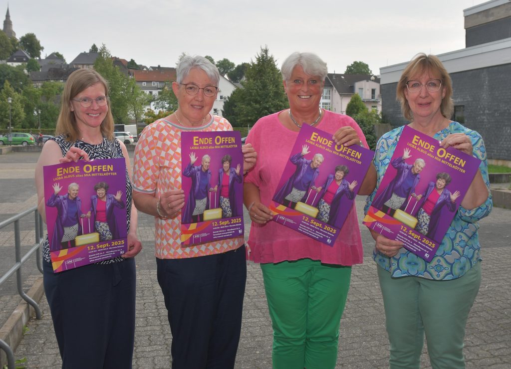 Veronika Wessel, Margit Preckel, Doris Hörstmann und Birgit Maas vom Leitungsteam der kfd laden zu einem Highlight des Jubiläumsjahres ein: Lioba Albus mit ihrem aktuellen Programm „Ende offen“.