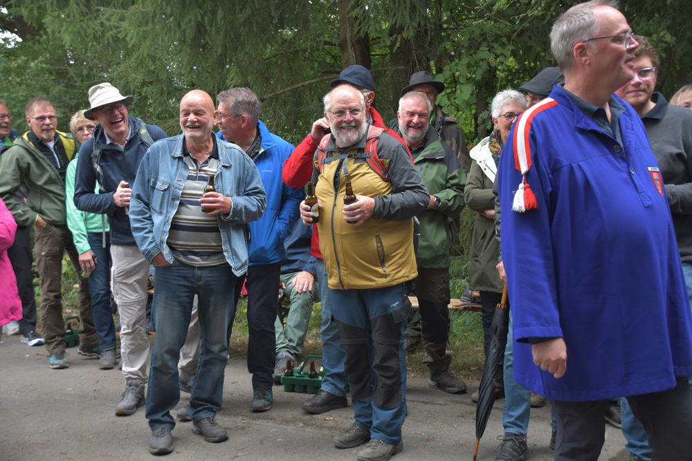 Von der Kapelle wanderten die Schnadgänger in Richtung Norden mit dem Ziel Hof Molitor. Dort hatten die Fußballer des TuS Belecke bereits ein deftiges Frühstücksbuffet angerichtet. Alle stärkten sich bei duftendem Kaffee, frischen Brötchen und mancher Leckereien. Mit der Belecker Stadtfahne voran wanderten sie zum nächsten Ziel, dem Grenzpunkt mit Drewer. Musikalisch wurden sie vom TuS Spielmannszug begleitet und der Weg führte durch den Wiebusch, über die Dumecke zur Drewer Heide und überquerten dort die Rüthener Landstraße und Möhne. Ziel war der Grenzstein am Möhnetalradweg zwischen Coers Gehre und den Wiesen im Lange Seifen. Dort steht der dicke Grenzstein direkt am Radfahrweg.